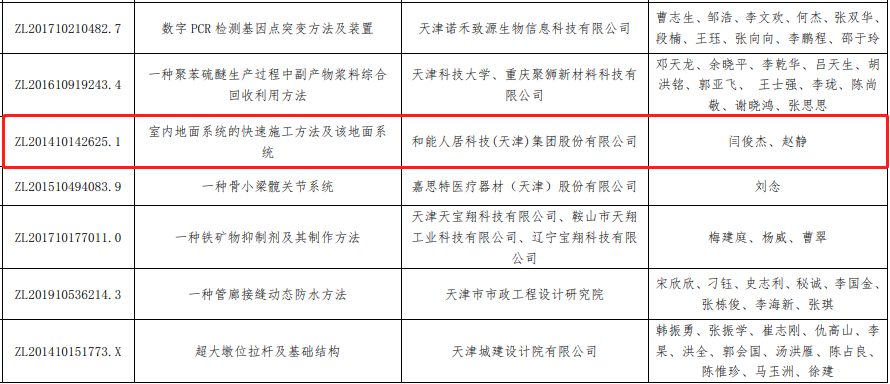 近日,天津市知識(shí)產(chǎn)權(quán)局公示了2022年度專利獎(jiǎng)評(píng)審結(jié)果,由和能人居科技申報(bào)的發(fā)明專利ZL201410142625.1“室內(nèi)地面系統(tǒng)的快速施工方法及該地面系統(tǒng)”榮獲天津市專利優(yōu)秀獎(jiǎng)。