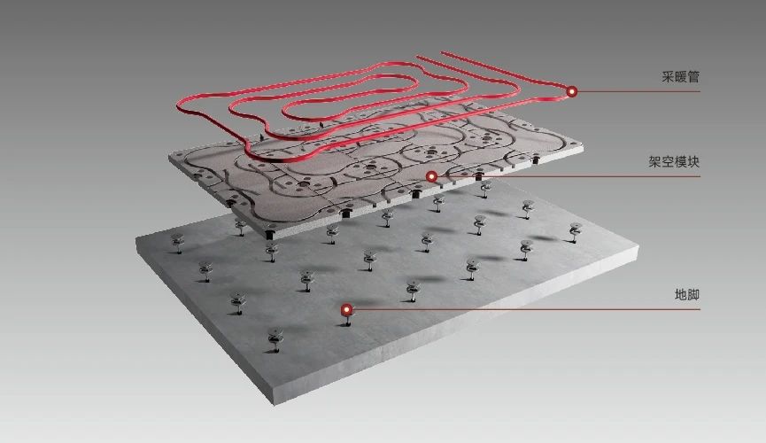 模塊化地面系統(tǒng)應用于走廊以及室內(nèi)居室空間。其中,4.0代采暖架空模塊被稱為萬能采暖模塊,由架空模塊、調(diào)平地腳螺栓(塑料和金屬兩種)以及采暖管三個主要部件組成,在設計上更加靈活多變,節(jié)省深化的同時,便于施工;4.5代采暖架空模塊采用與4代相同的基材配比和制程工藝,其表面孔隙率低,適用于各類面層;5代非采暖架空模塊是一款專為無采暖需求的地區(qū)或空間設計的架空地面模塊,模塊更輕薄,它結合了現(xiàn)代建筑的高效施工需求和優(yōu)越的居住體驗。