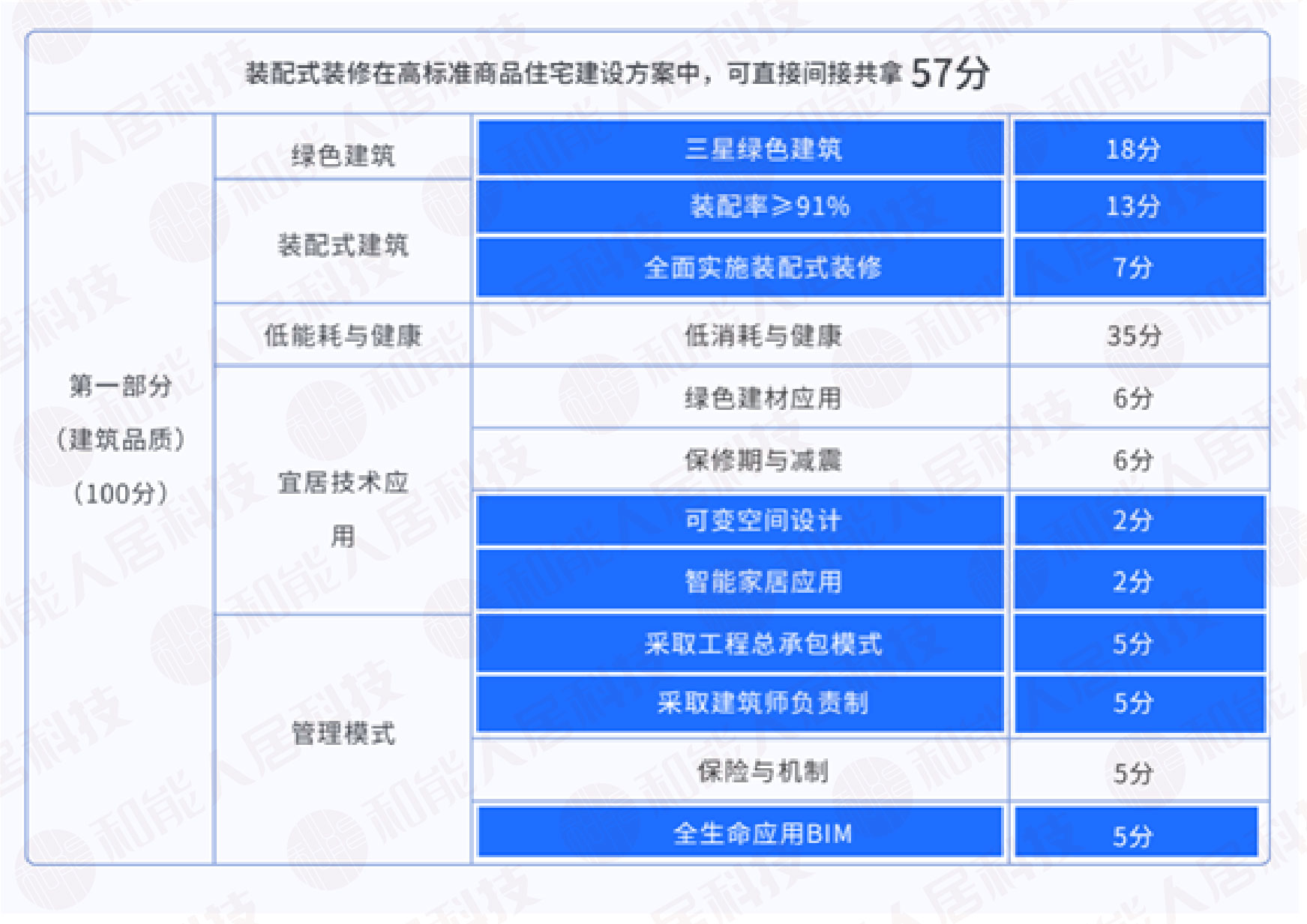 從首輪出讓條件的高標(biāo)準(zhǔn)評(píng)分表來看,裝配式建筑板塊,裝配式裝修不僅在“全面實(shí)施裝配式裝修”項(xiàng)直接拿7分,在91%裝配率方面直間接可拿到48%的裝配率。在整體建筑品質(zhì)部分的100分中,裝配式裝修可直接、間接助力高標(biāo)準(zhǔn)商品住宅建筑品質(zhì)拿57分,在高標(biāo)準(zhǔn)商品住宅評(píng)分標(biāo)準(zhǔn)中有著舉足輕重的作用。